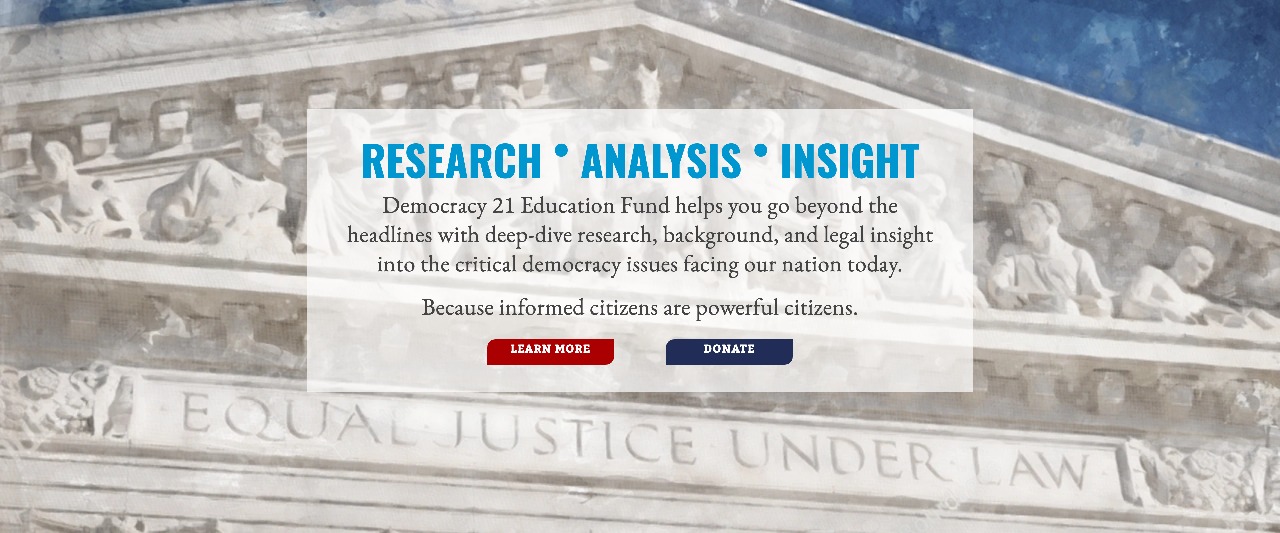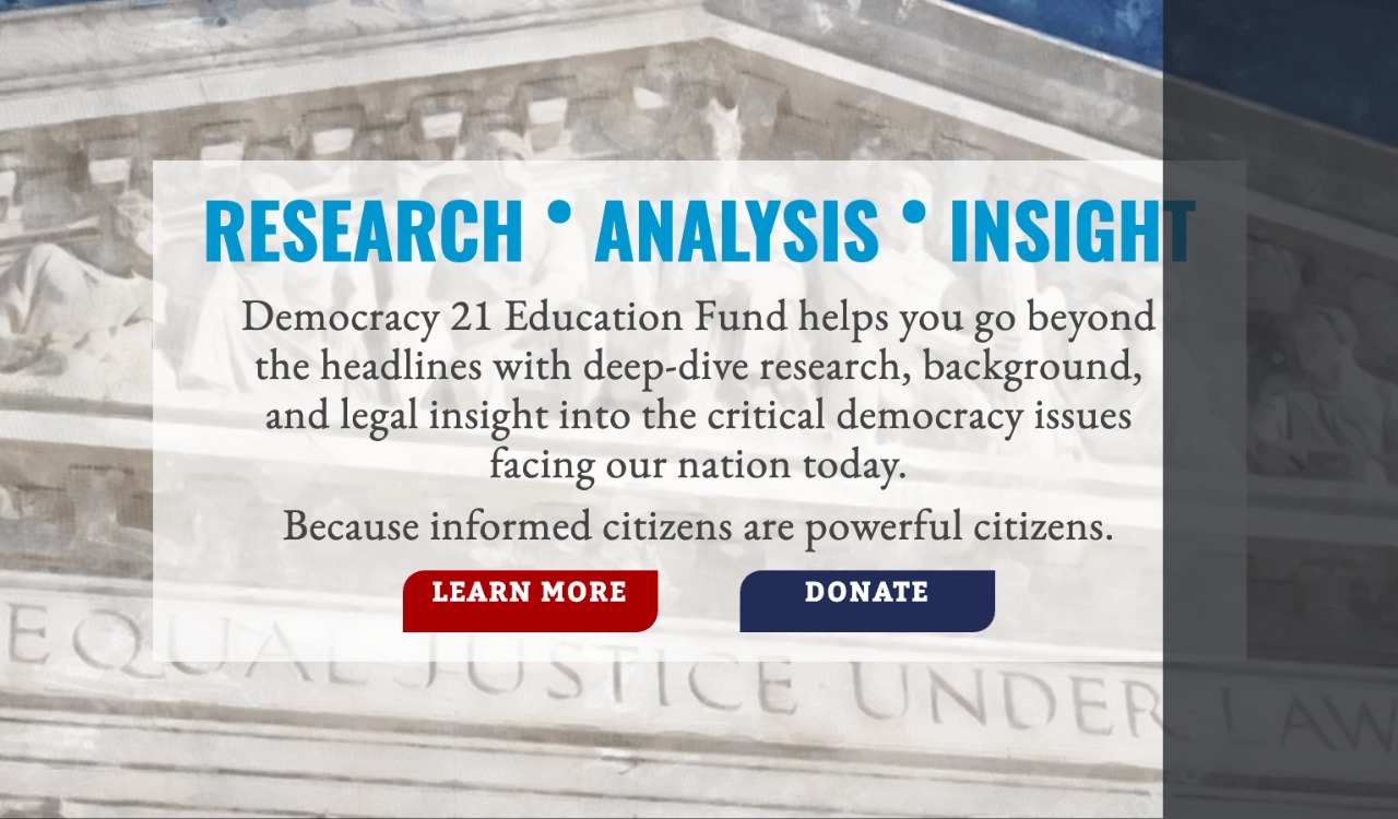 Democracy 21 Education Fund helps you go beyond the headlines with deep-dive research, background, and legal insight into the critical democracy issues facing our nation today.